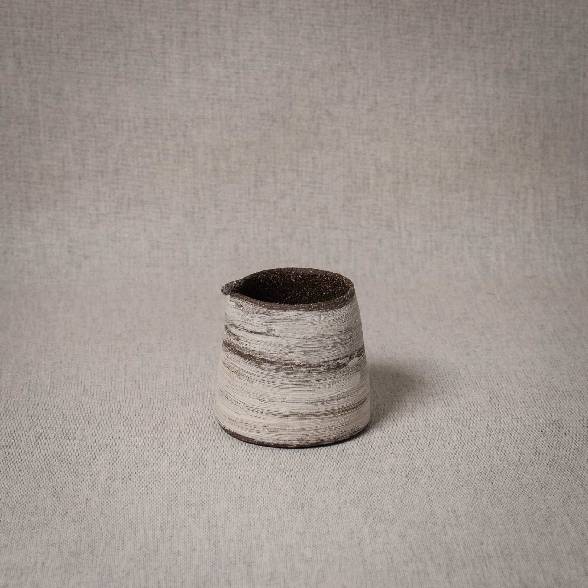The plate and the inside of the bowl are glazed in a matte glaze, for cleaning purposes. The pourer is also glazed on the inside, while the outside is left unglazed to enhance the tactile experience.