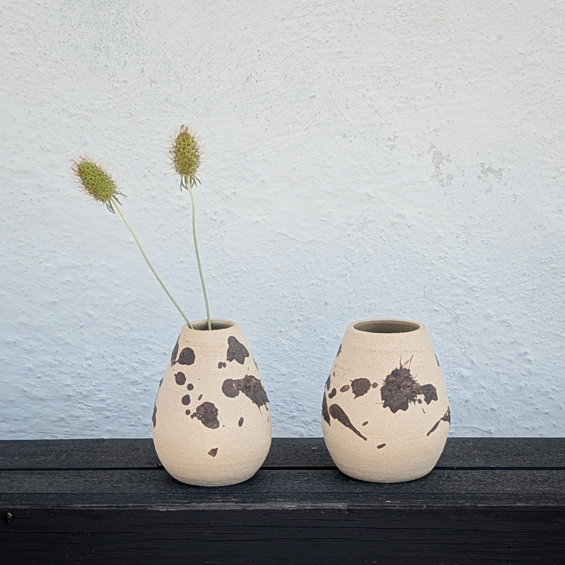 Hakeme is a Japanese technique where you paint with a contrasting engobe (liquid clay) and let the brushstrokes show through. Here I have worked with darker engobes on light clay. The dark one is a brownish-black stoneware clay, and the lighter one is an earthenware clay that has melted out and is partially shiny.
