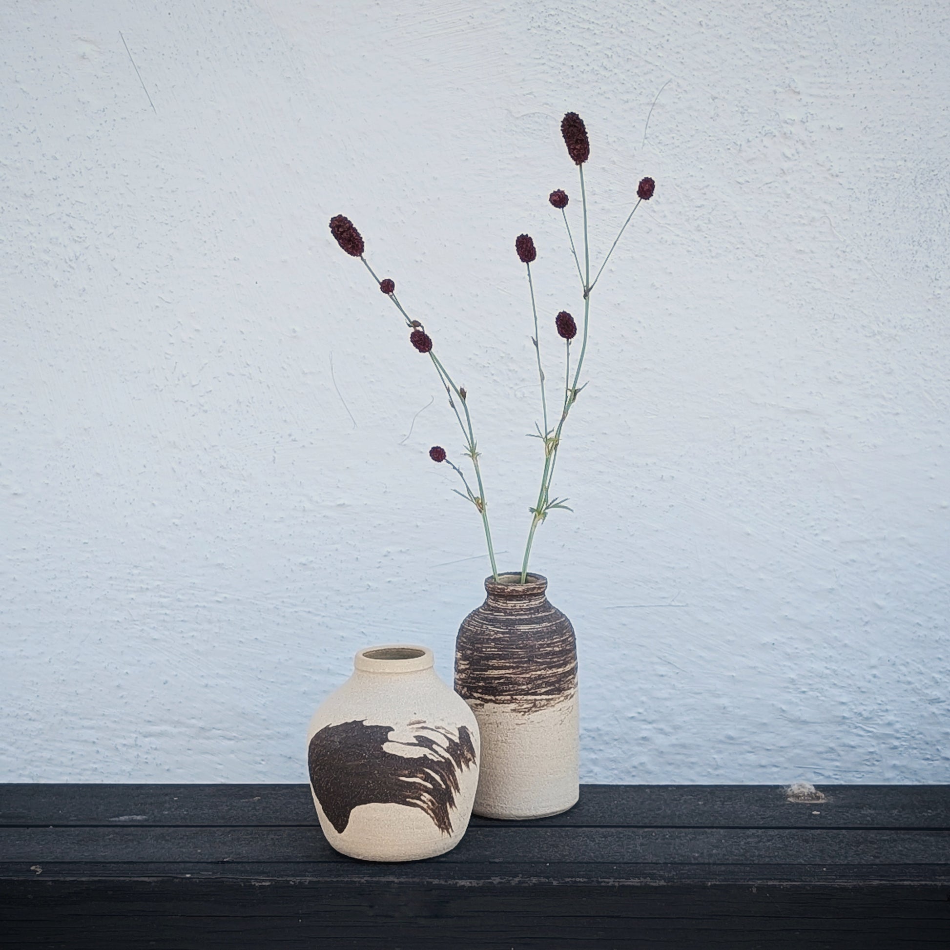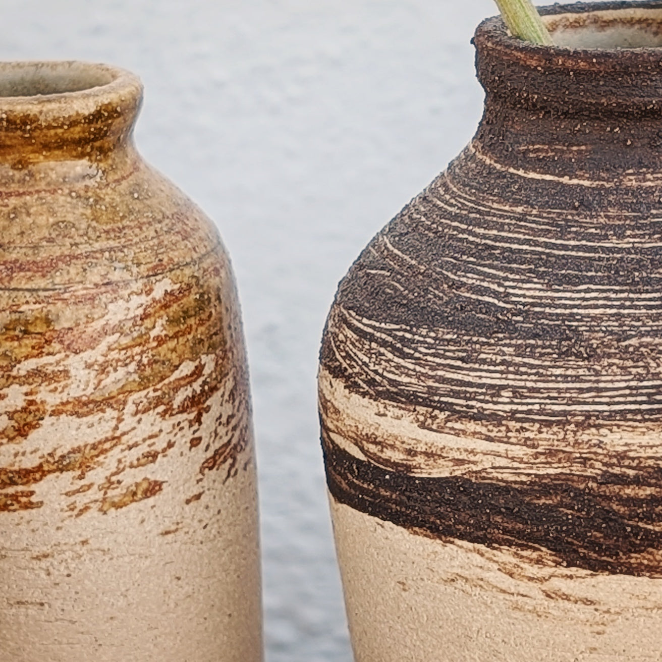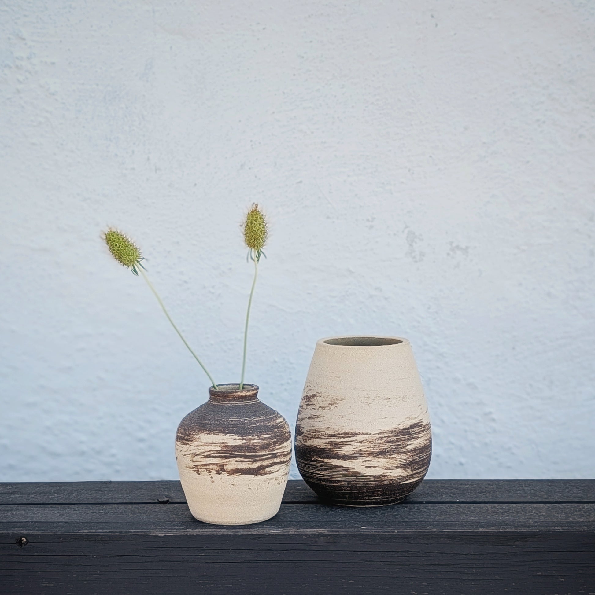Hakeme is a Japanese technique where you paint with a contrasting engobe (liquid clay) and let the brushstrokes show. Here I have worked with darker engobes on light clay. The dark one is a brownish-black stoneware clay, and the lighter one is an earthenware clay that has melted out and is partially shiny.