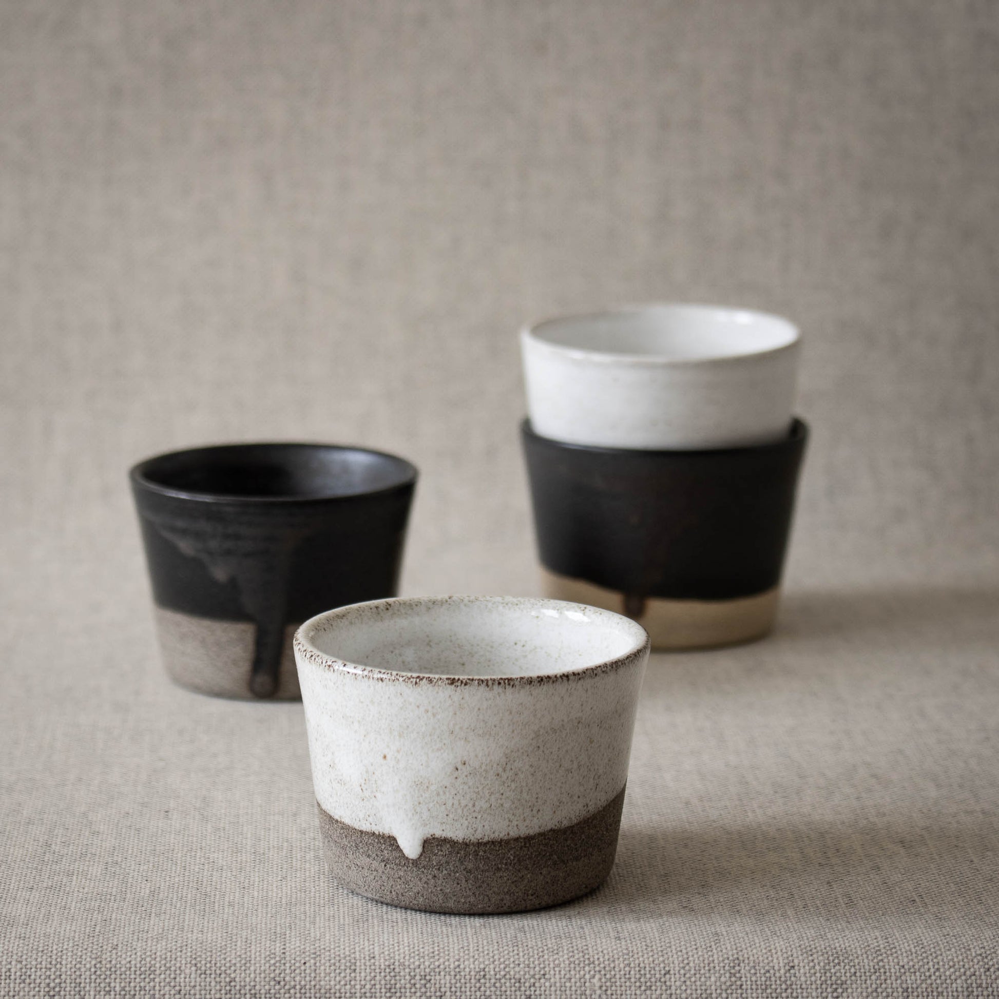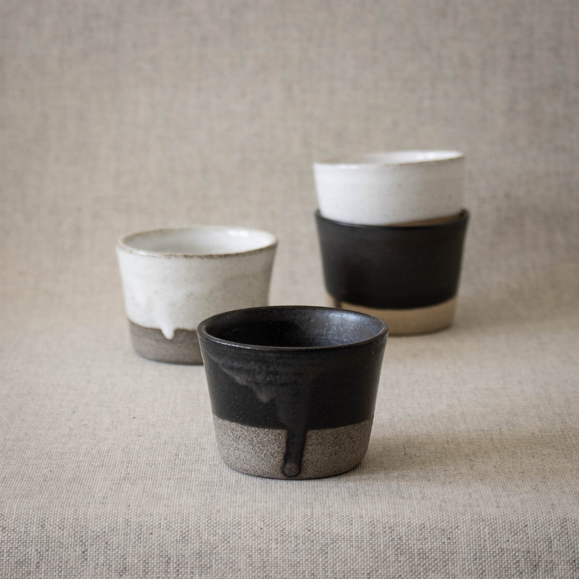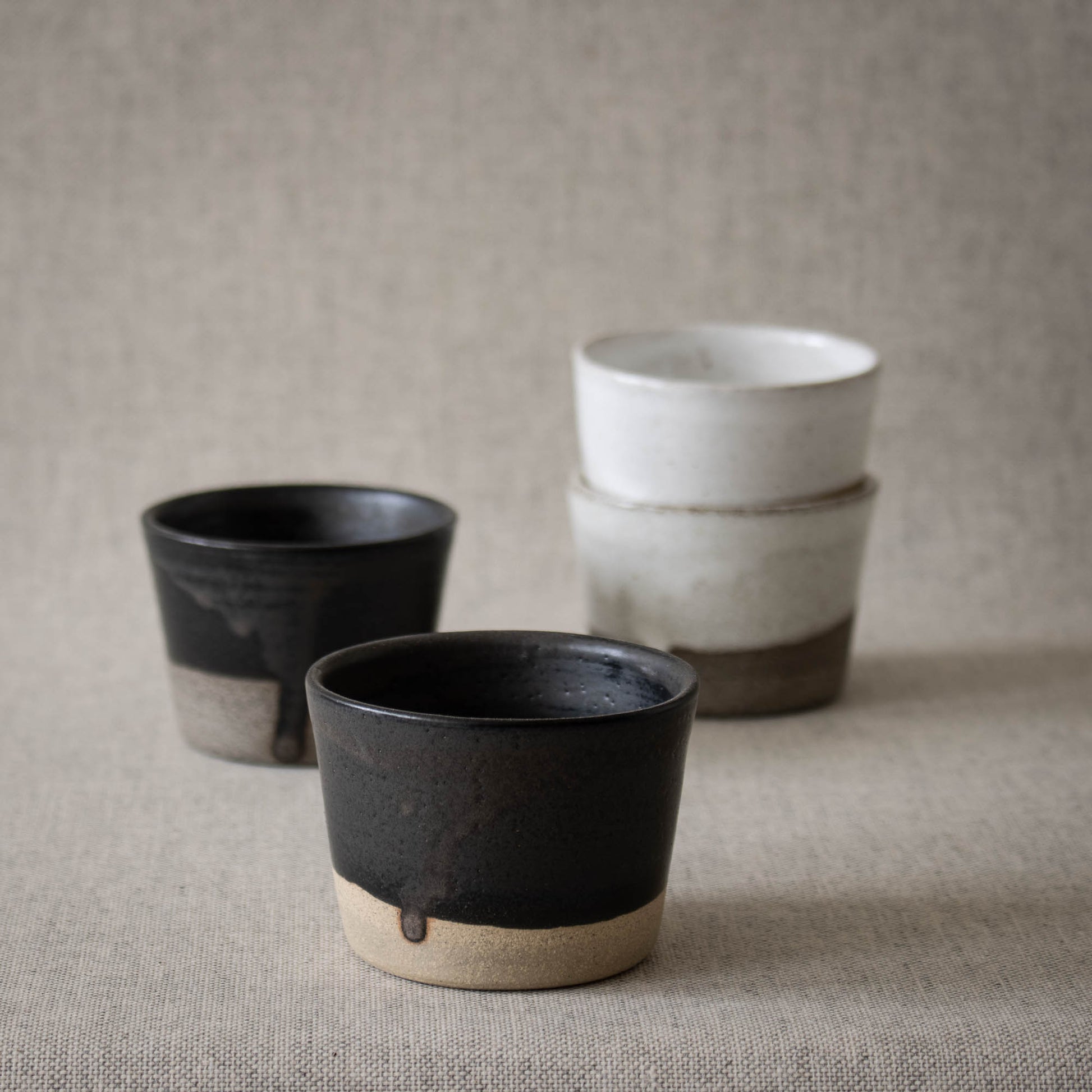Mug without handle. With a softly rounded bottom so that it is comfortable to hold with both hands.