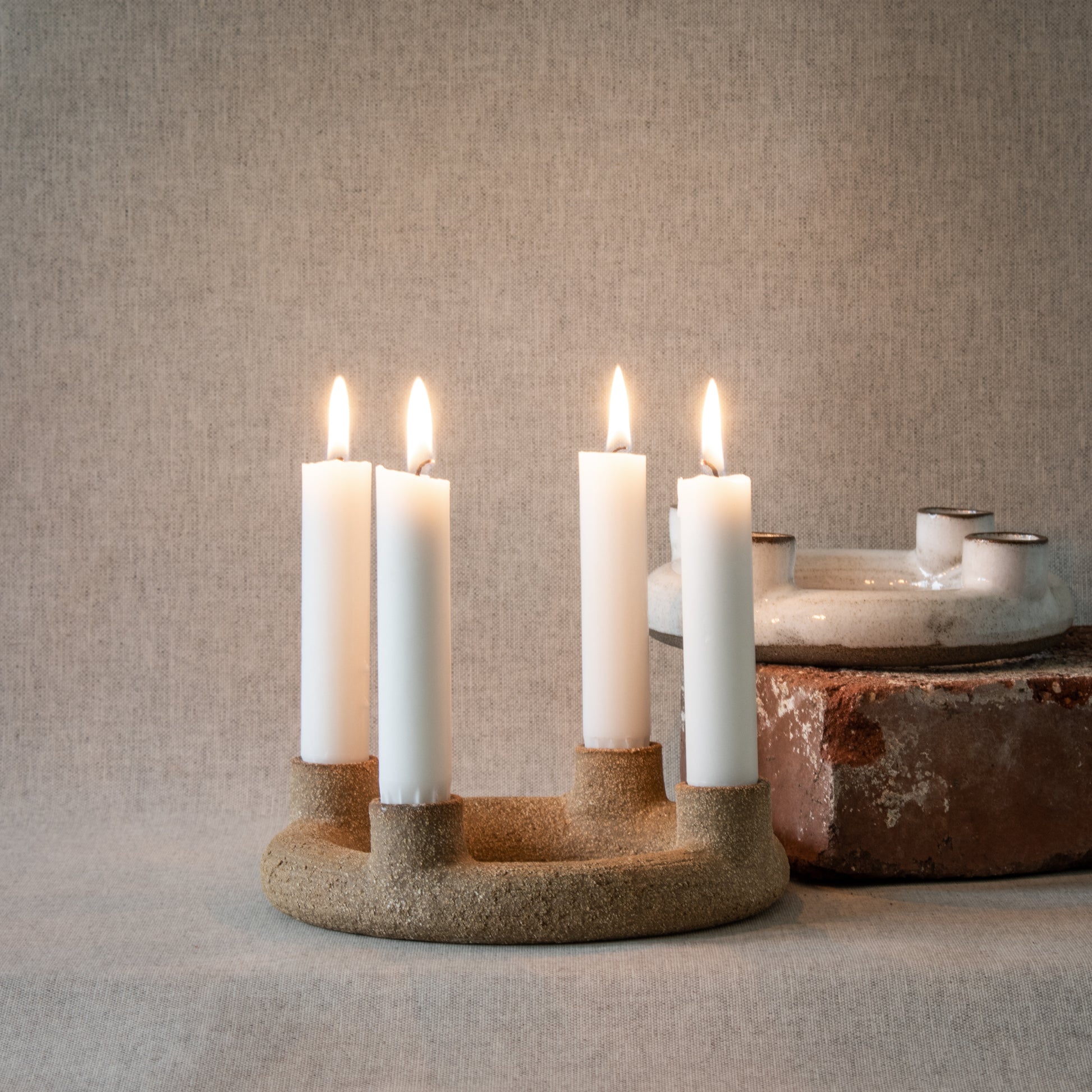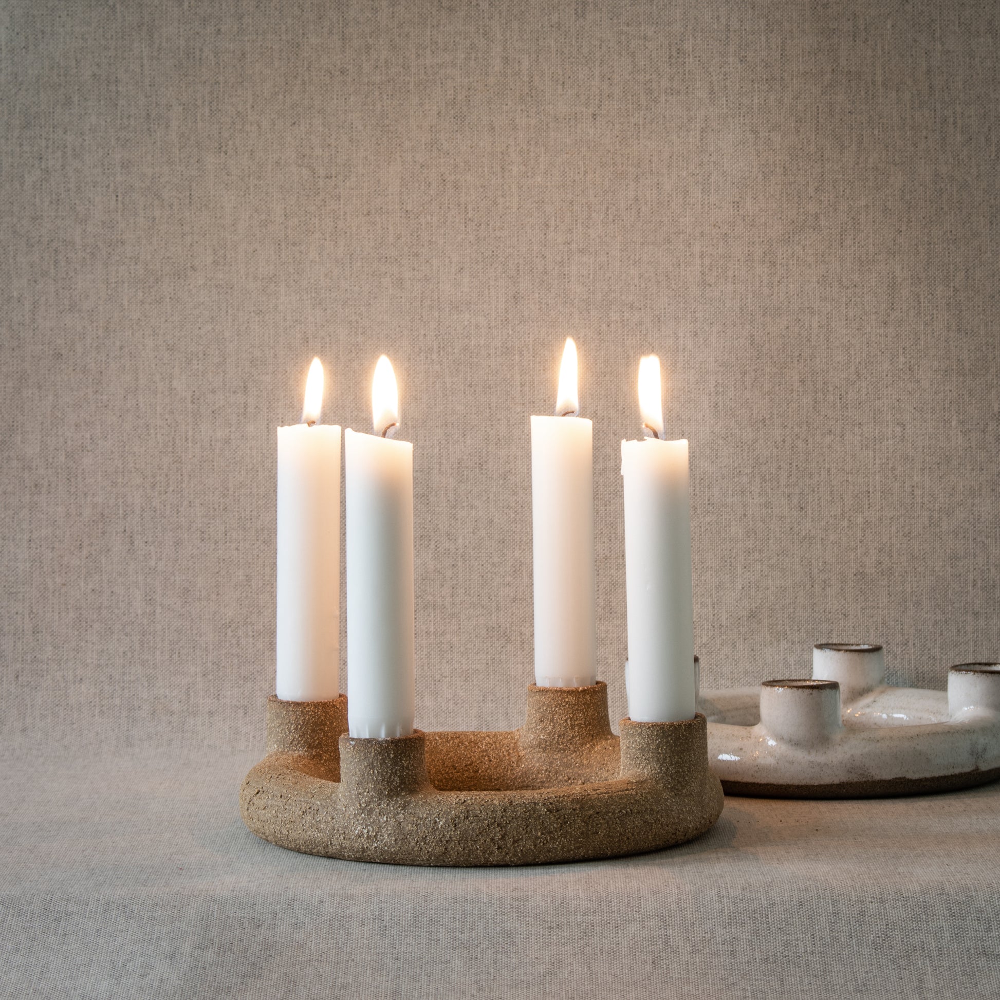 Ljusstake med hållare för 4 ljus, så att den blir en stilig adventsljusstake. Drejad i grå lera, glaserad i vit glasyr.