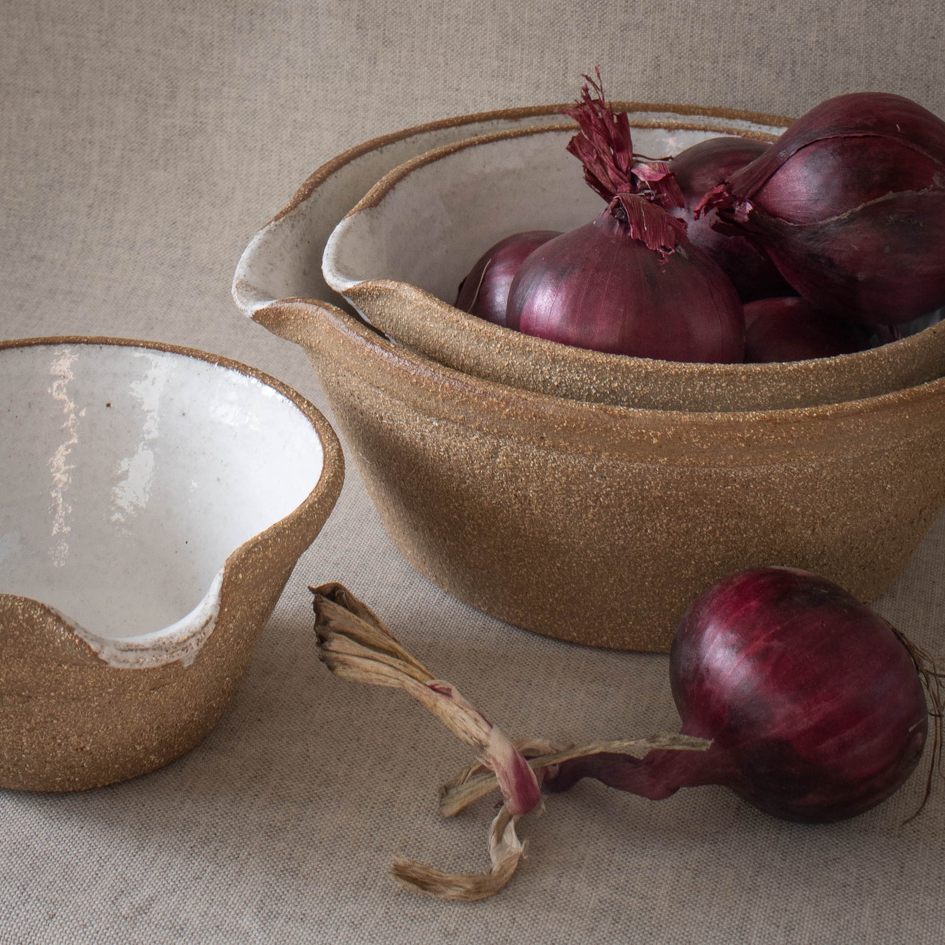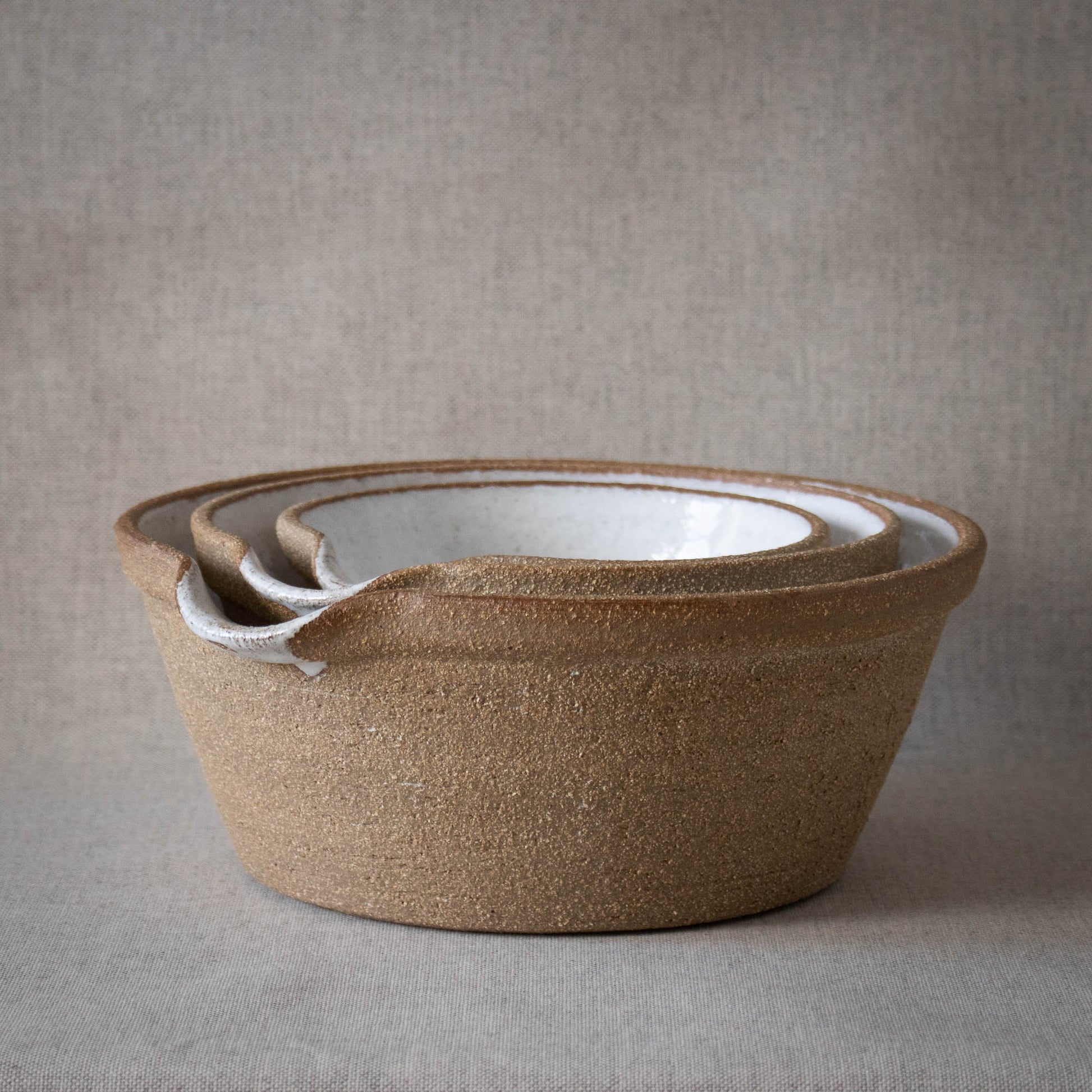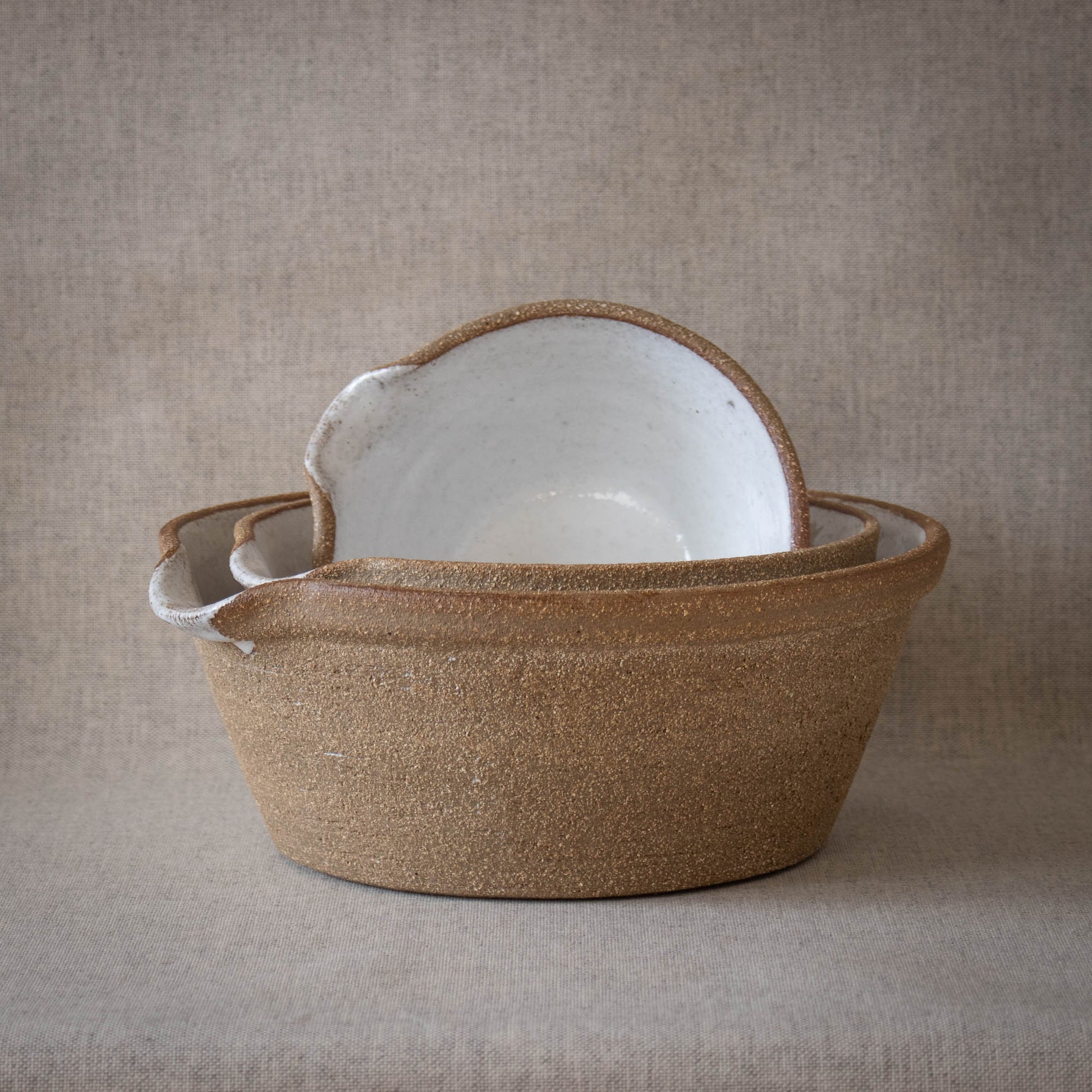 En klassisk form av tre skålar med pip, i en grov beige lera och med en blank vit glasyr på insidan. Skålarna passar bra i köket både som vispskål, salladsskål eller kanske som en fruktskål som står framme på ett bord.
