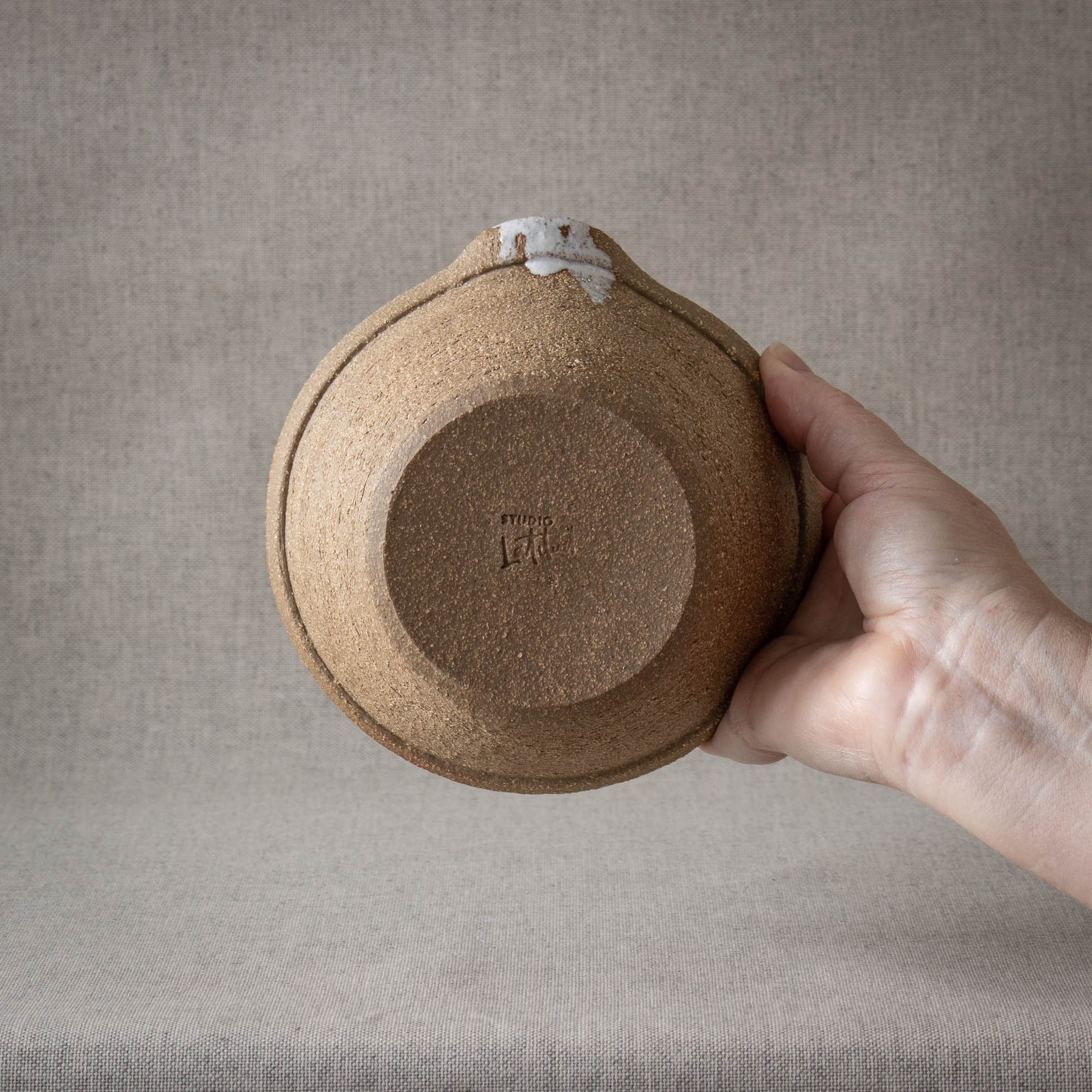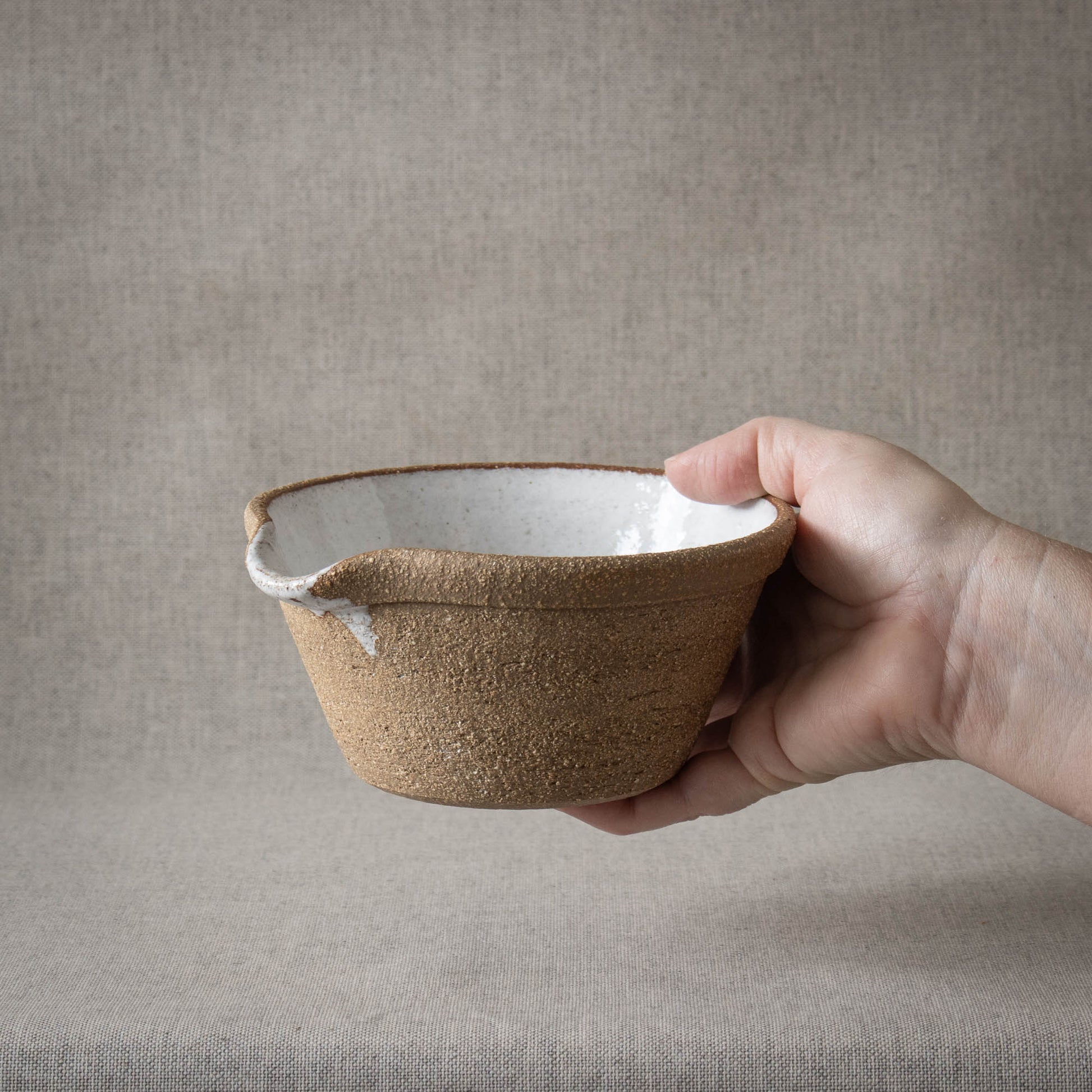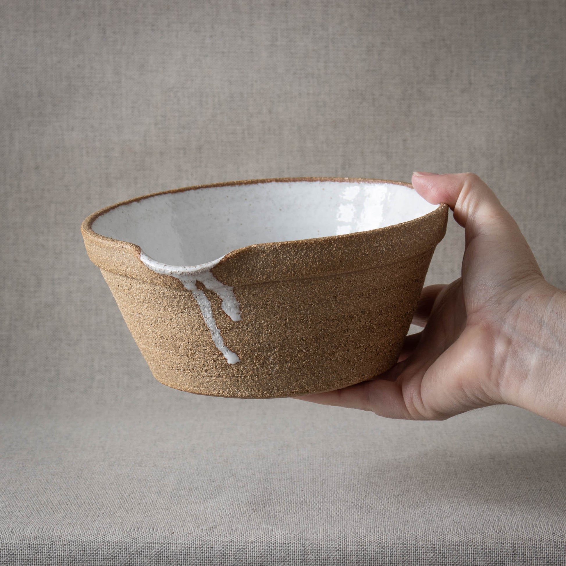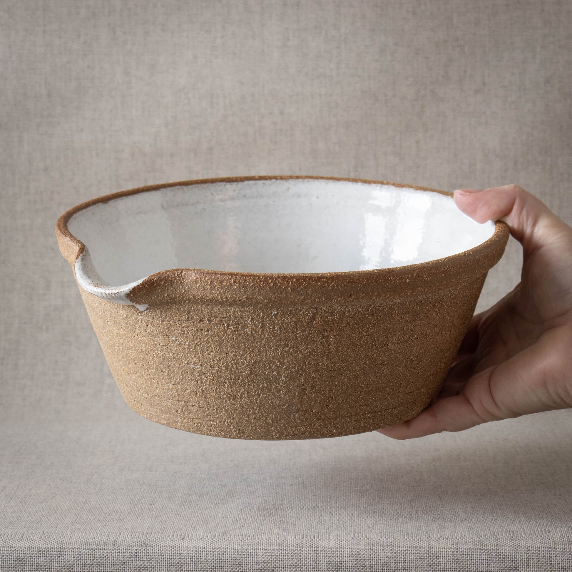 En klassisk form av tre skålar med pip, i en grov beige lera och med en blank vit glasyr på insidan. Skålarna passar bra i köket både som vispskål, salladsskål eller kanske som en fruktskål som står framme på ett bord.
