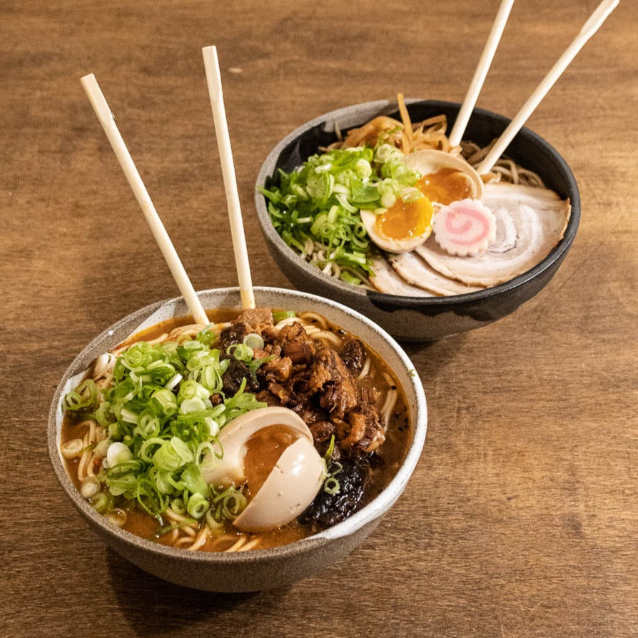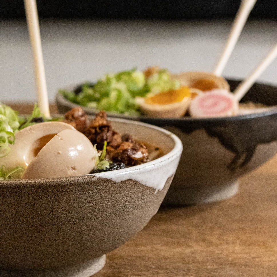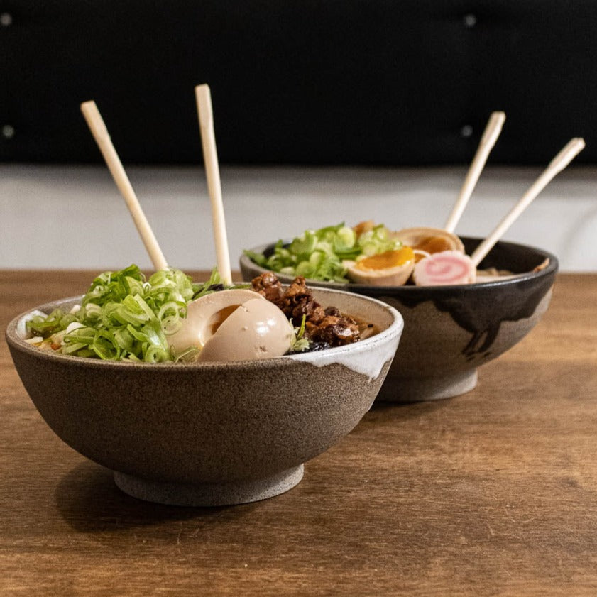 Skålarna har en stadig fotring, så att de både står stadigt och går att hålla i om du vill äta dina ramen med skålen i handen.