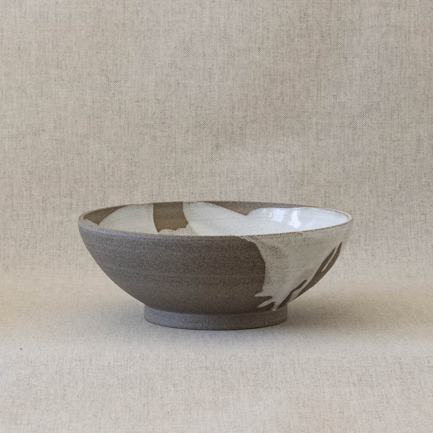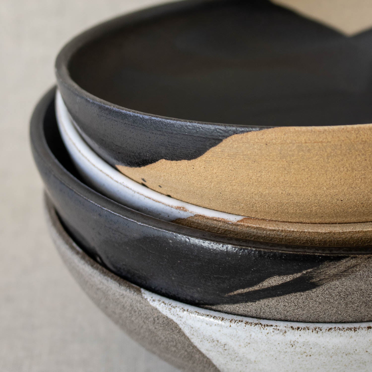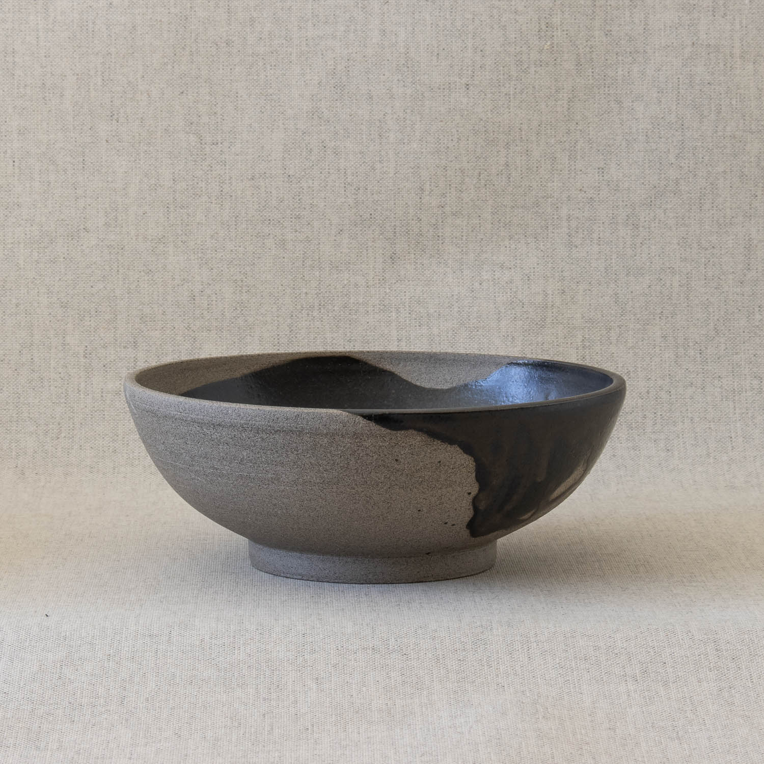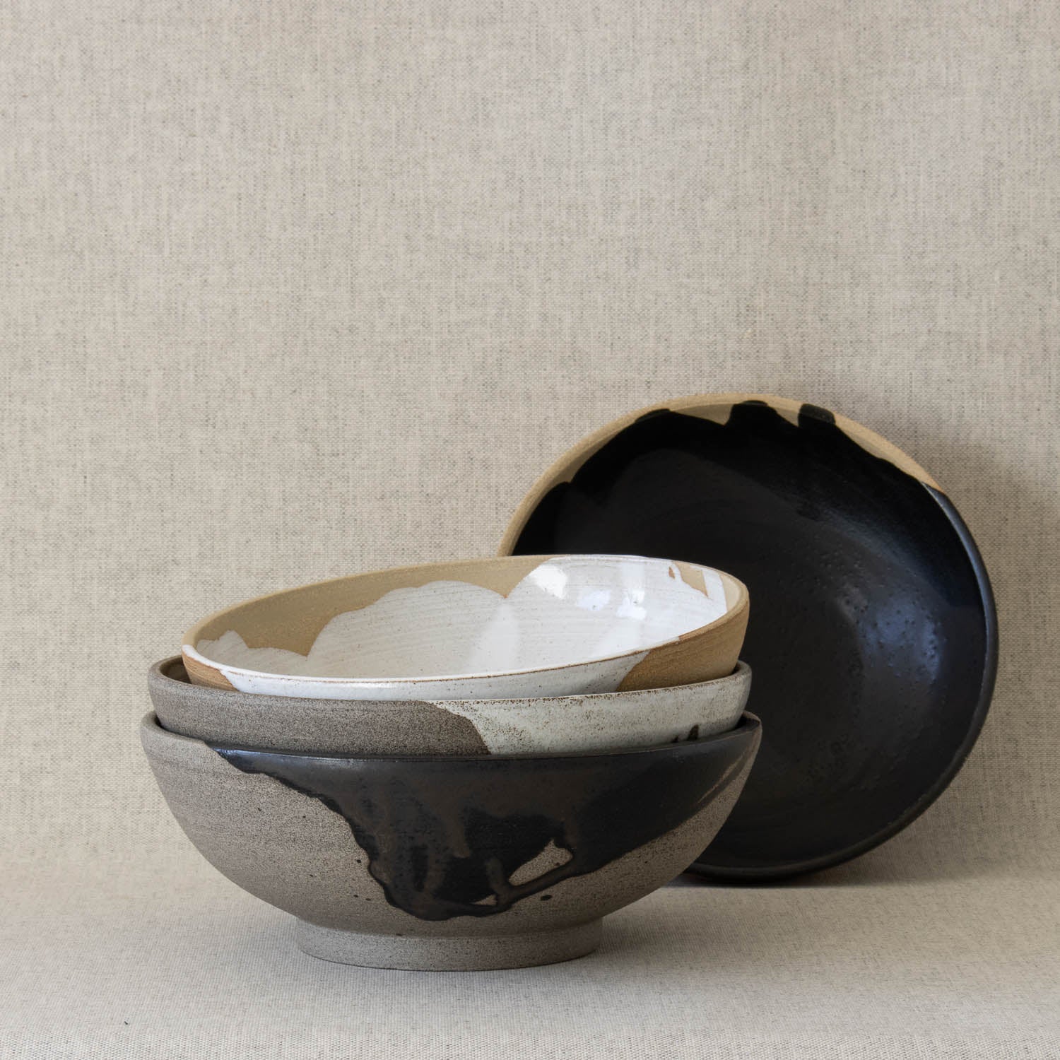 Finns i två olika leror (grå och beige) och två olika glasyrer (vit blank och svart sidenmatt). Glaserad på insidan och med rinn över kanten till den rå och oglaserade utsidan. Den oregelbundna glaseringen ger varje skål sin egen unika identitet.
